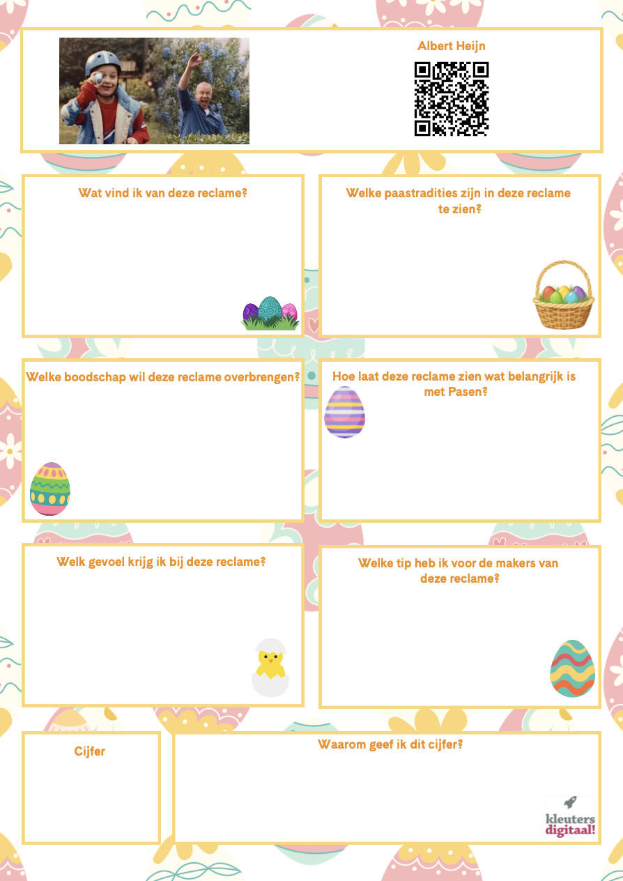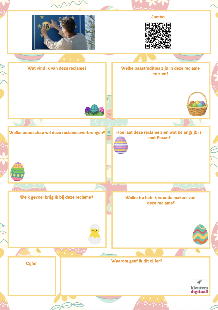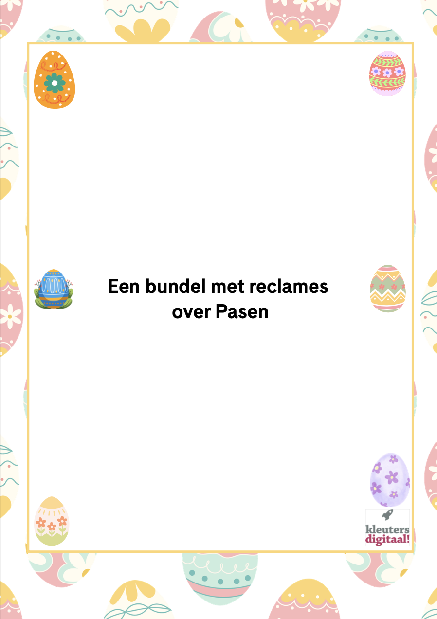 Het thema Pasen is steeds belangrijker geworden voor reclame makers. Daar wilde ik iets mee doen! Daarom bedacht ik deze bundel met kijk opdrachten. Bij elke reclame worden de volgende vragen gesteld: