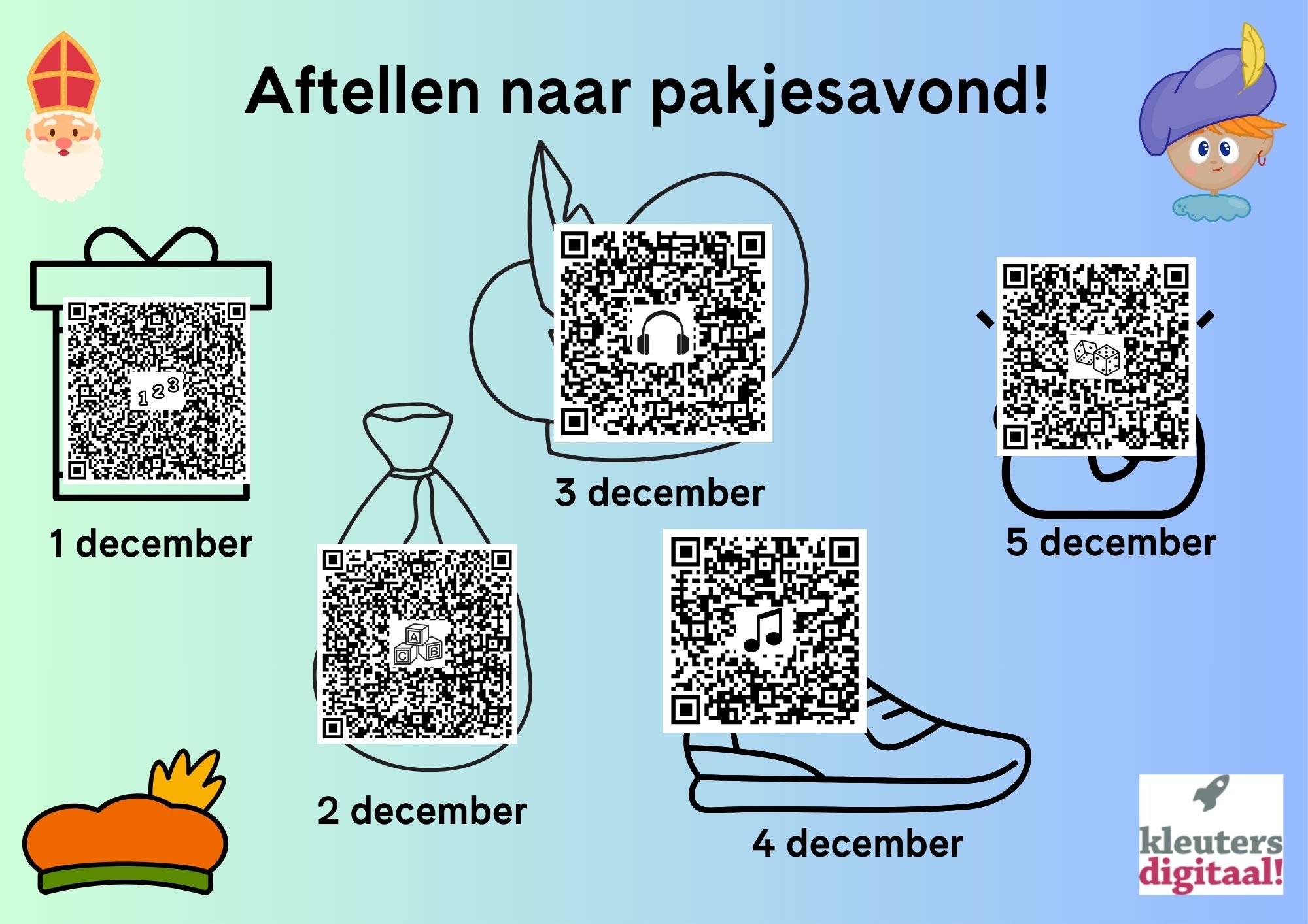 Elke week zal er een nieuwe week van de aftelkalender komen. Het werkt simpel elke dag kun je een QR code scannen. Achter deze QR code zit een activiteit. De activiteiten zijn gekoppeld aan een ontwikkelingsgebied. Op deze manier koppel je digitale geletterdheid aan ontwikkelingsgebieden waar je toch al aan wilt werken.