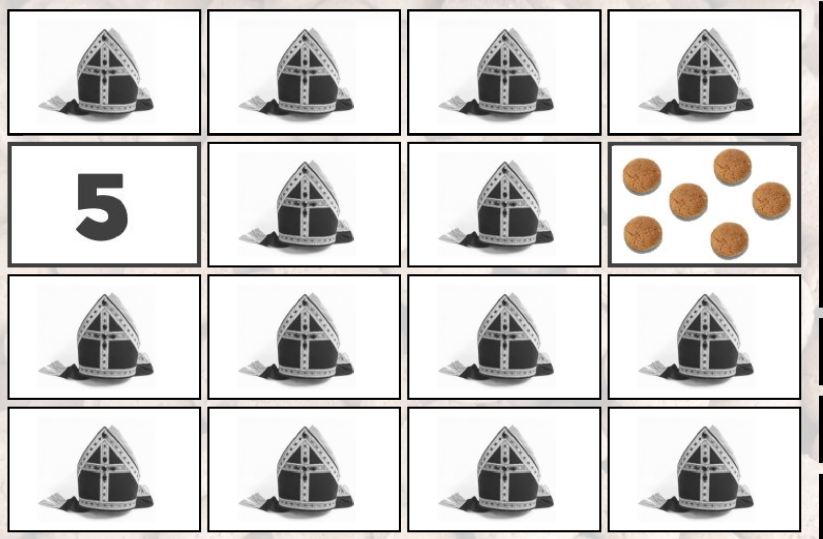 Maandag is altijd de dag waarop je een rekenactiviteit gaat doen. Deze week staat pepernoten memory op het programma. Je ziet een getal. En moet daar het juiste aantal pepernoten bij vinden.