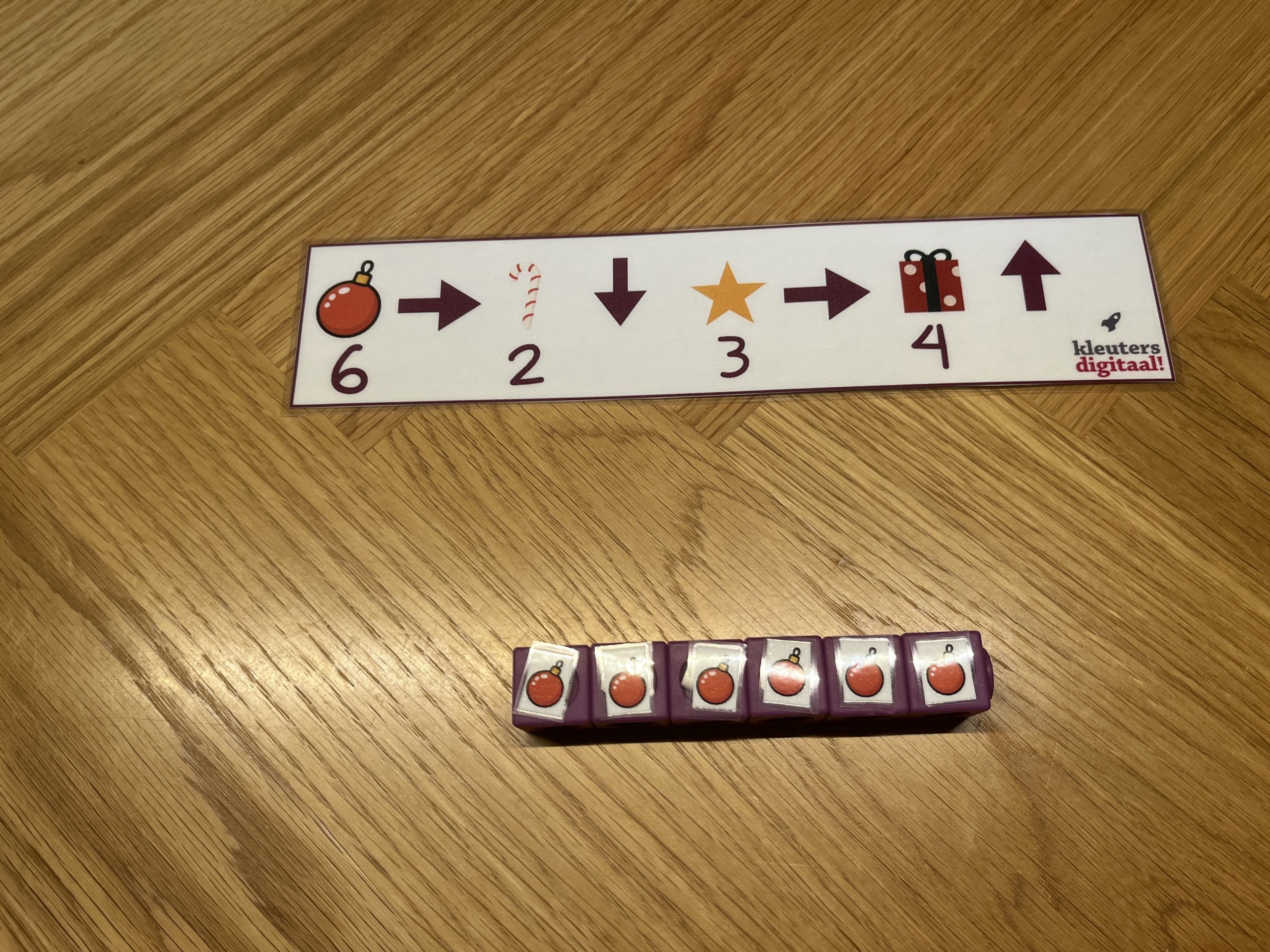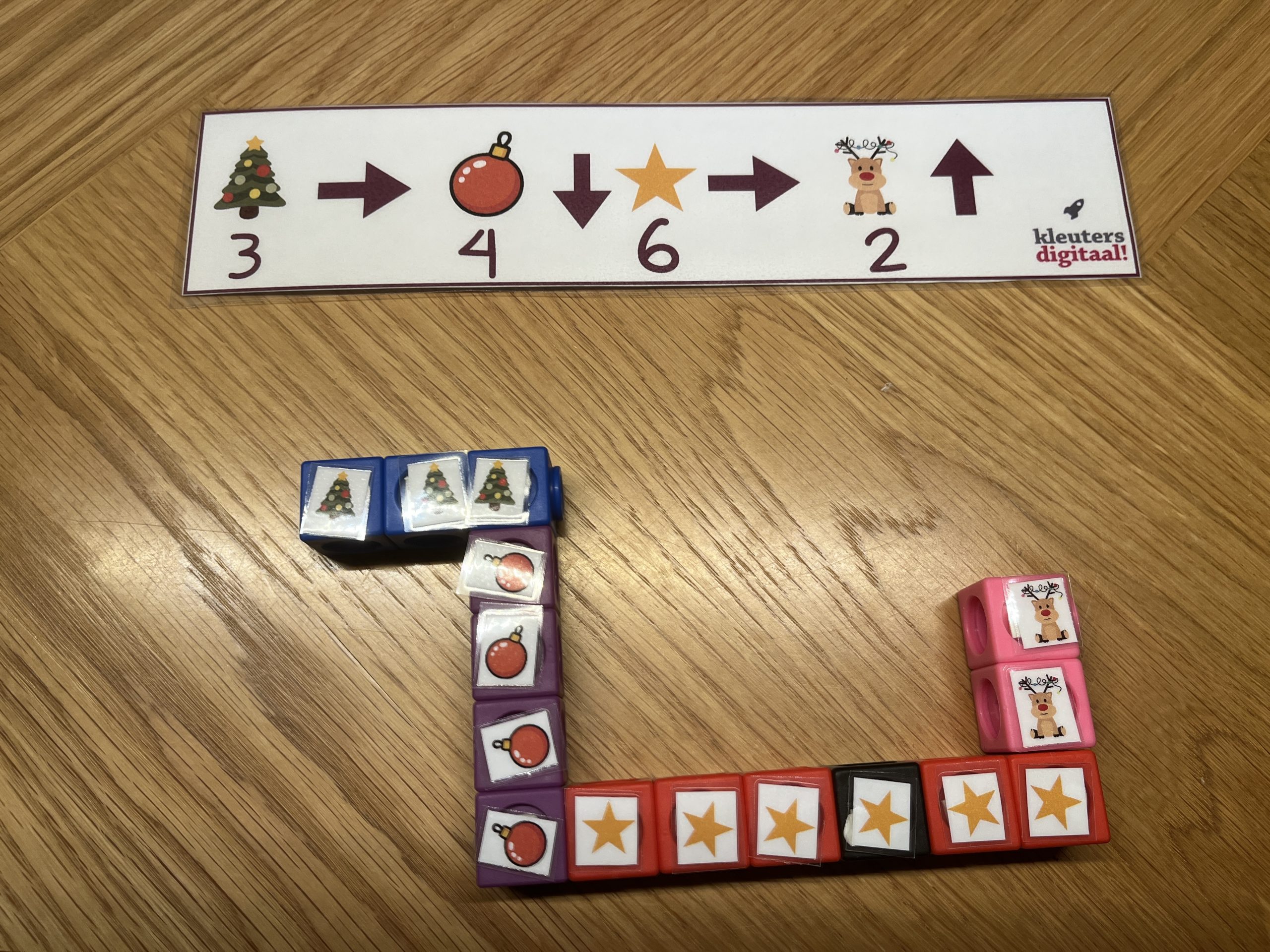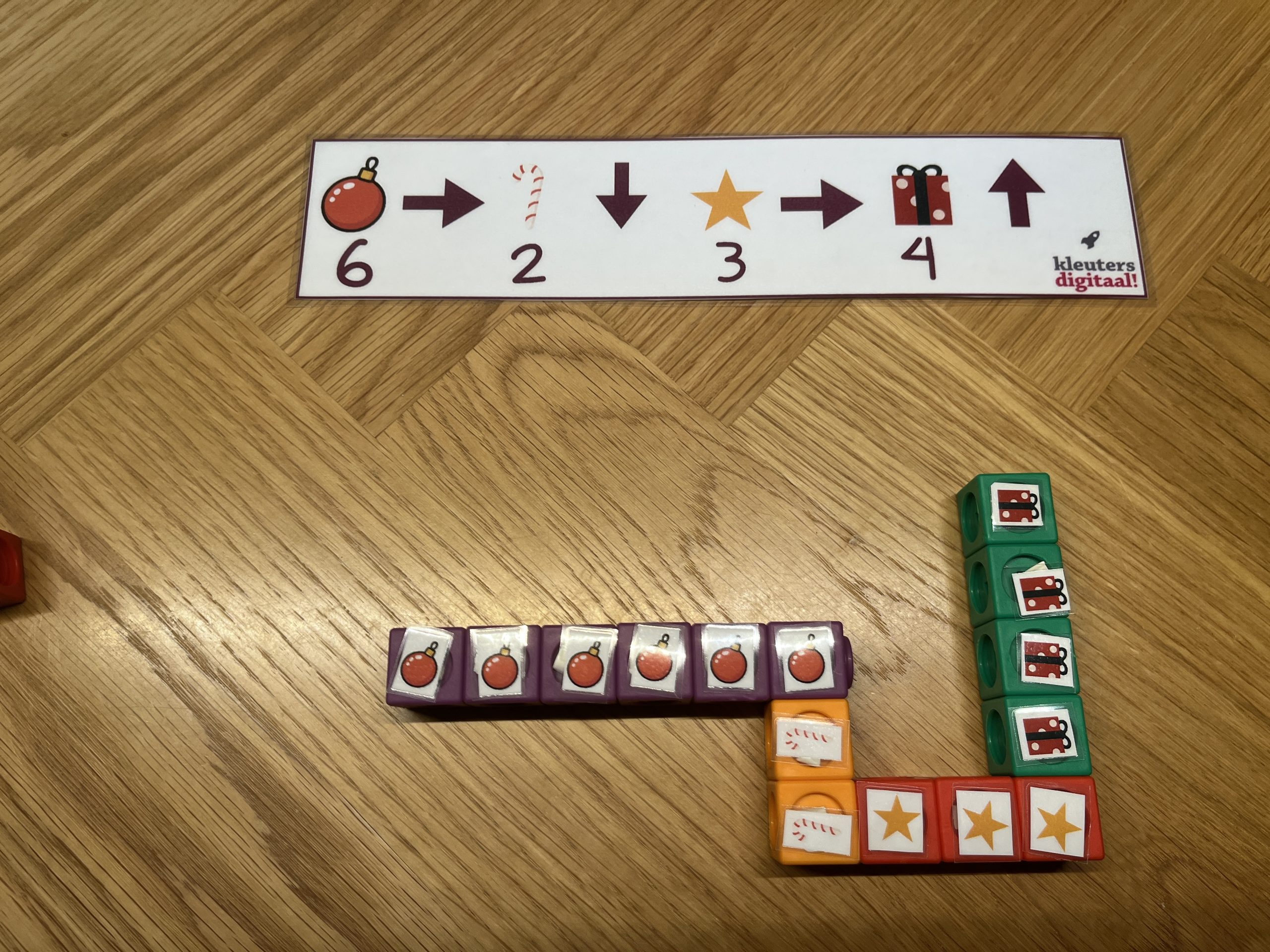 Het is belangrijk dat je de kleuters stap voor stap uitlegt hoe ze de code moeten lezen. En hoe ze deze om kunnen zetten naar de blokjes. Is de code af? Dan laat je ‘m door iemand anders checken!