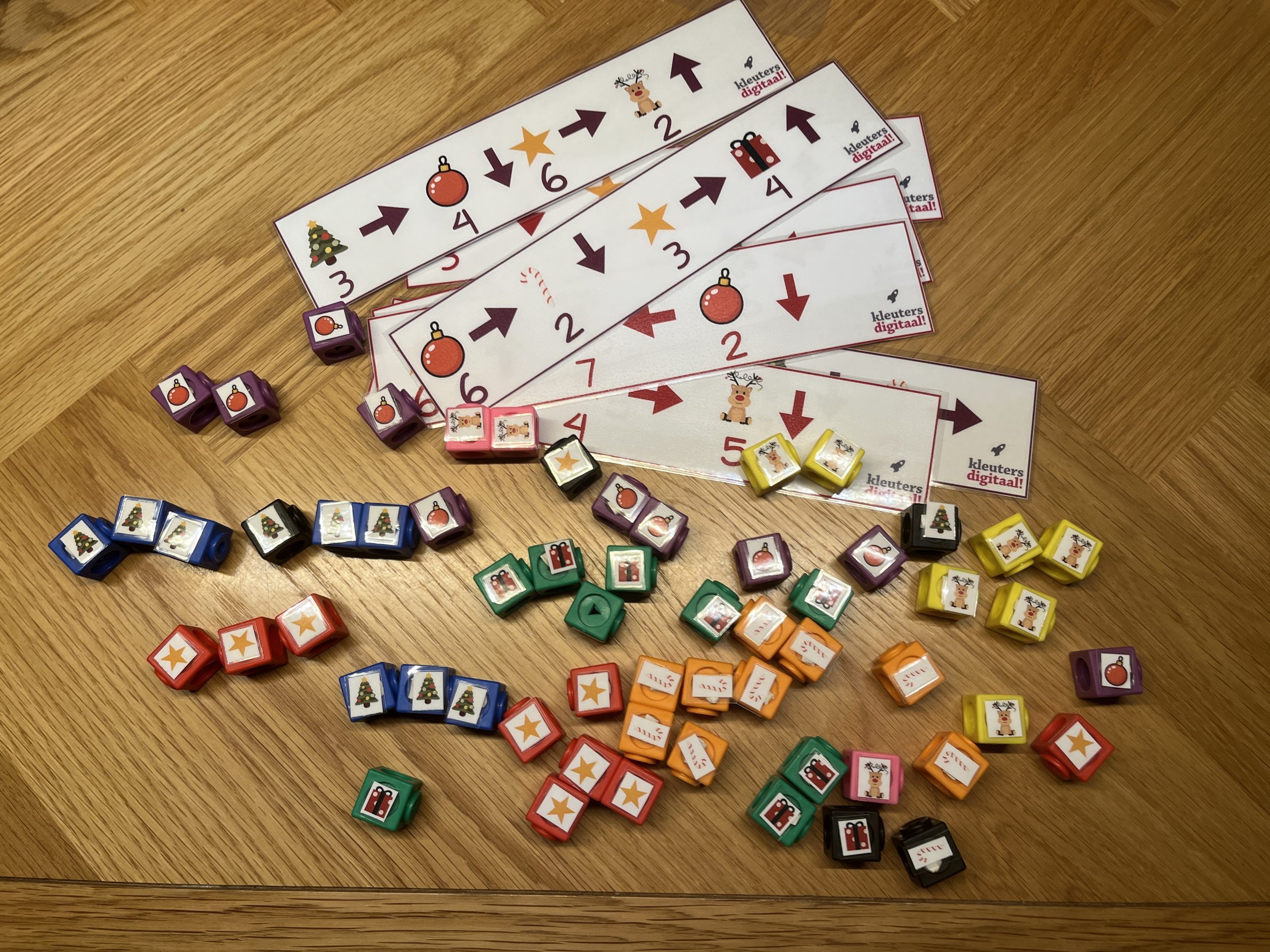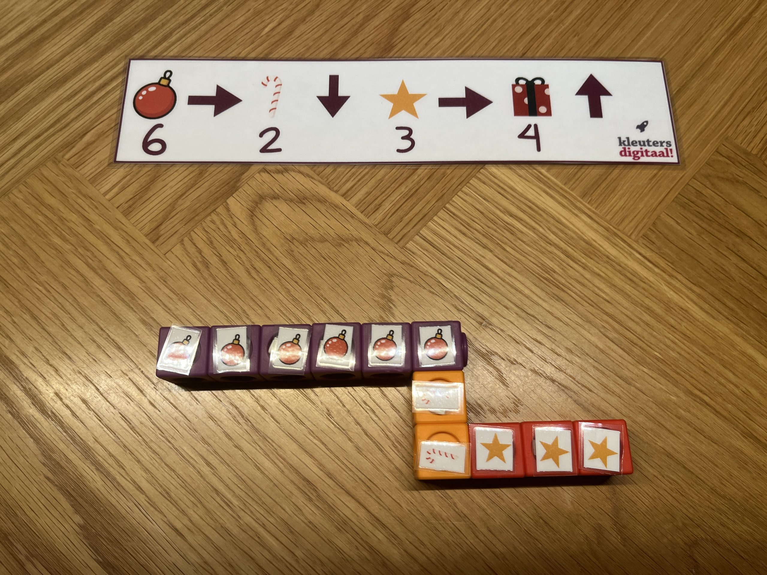 Opdrachten van waaruit je kunt werken. Deze download je hier. De opdrachten zijn er op twee niveaus. Rood is 3 stappen. Paars is 4 stappen. In de opdrachten download zitten ook de afbeeldingen die je op de snap cubes kunt plakken.