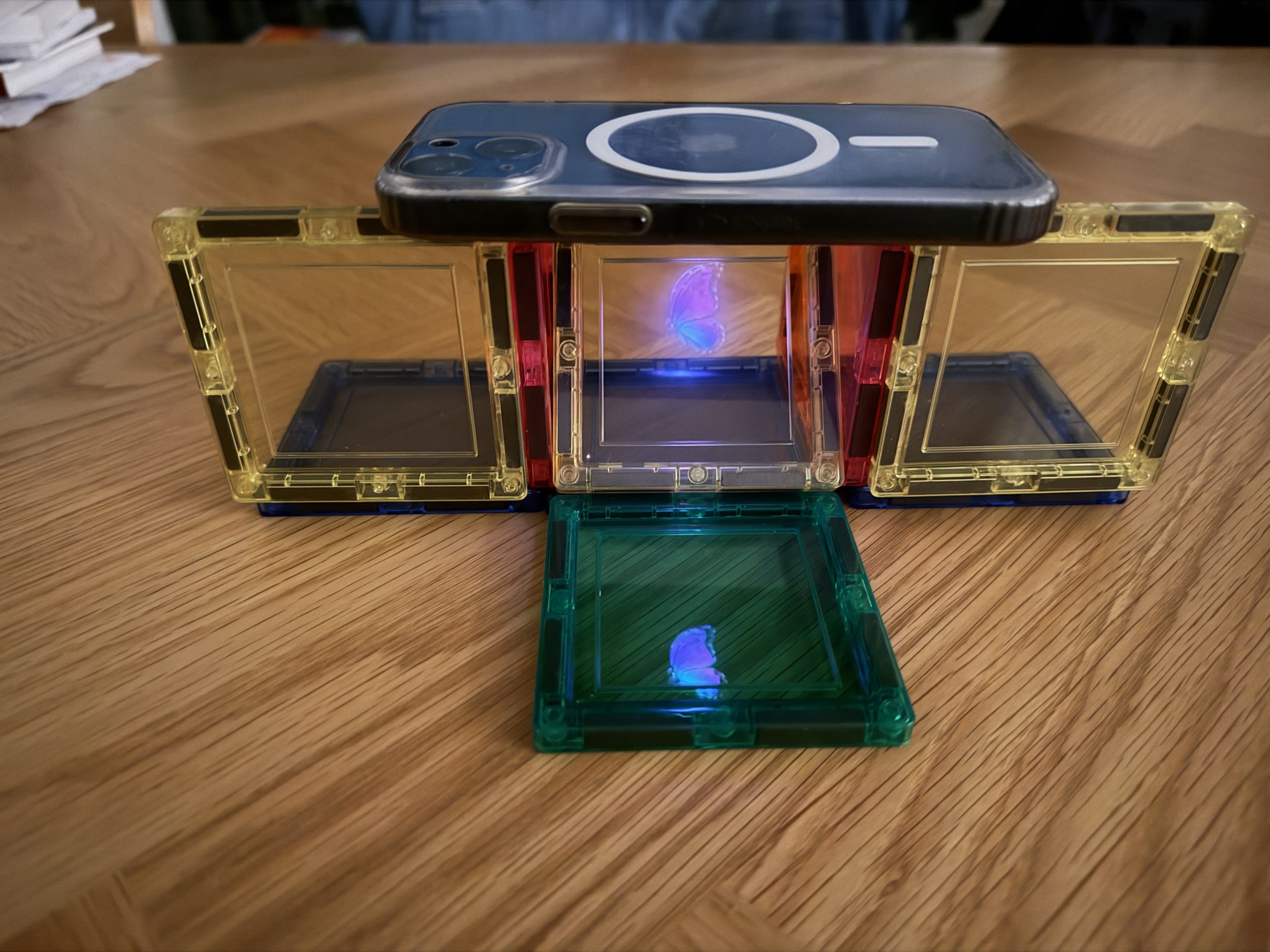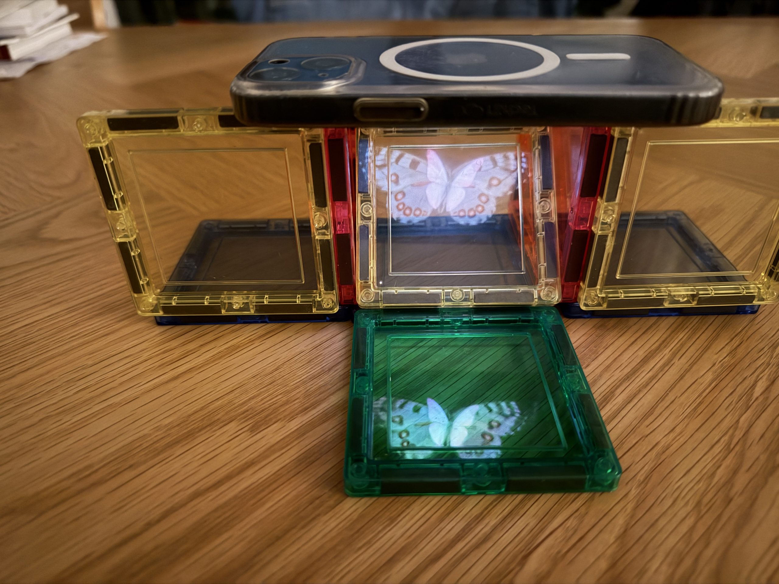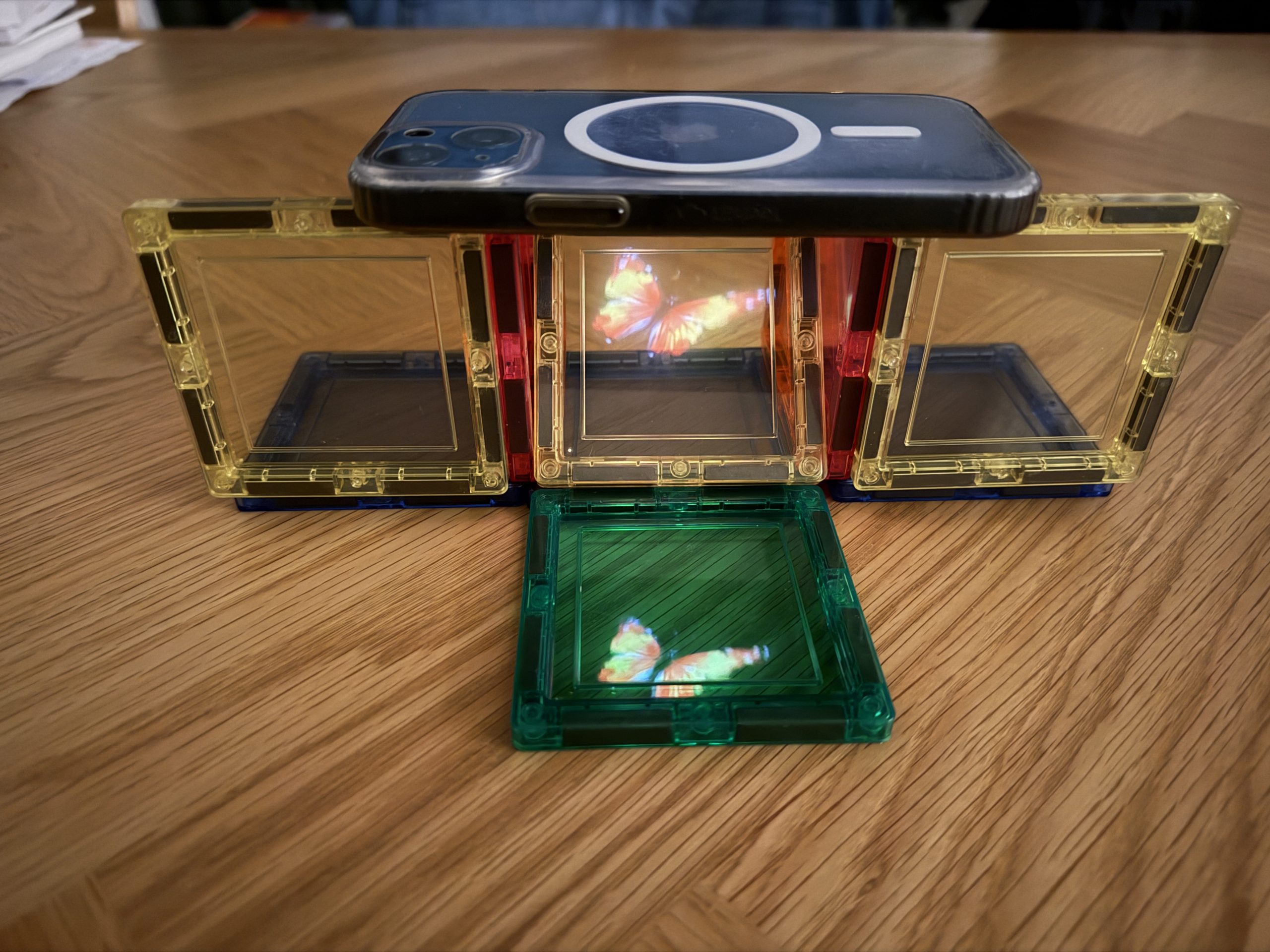 Op de schuinen figuren leg je een vierkant. Dit is belangrijk want de hologram heeft een specifieke hoek nodig om op te kunnen verschijnen.